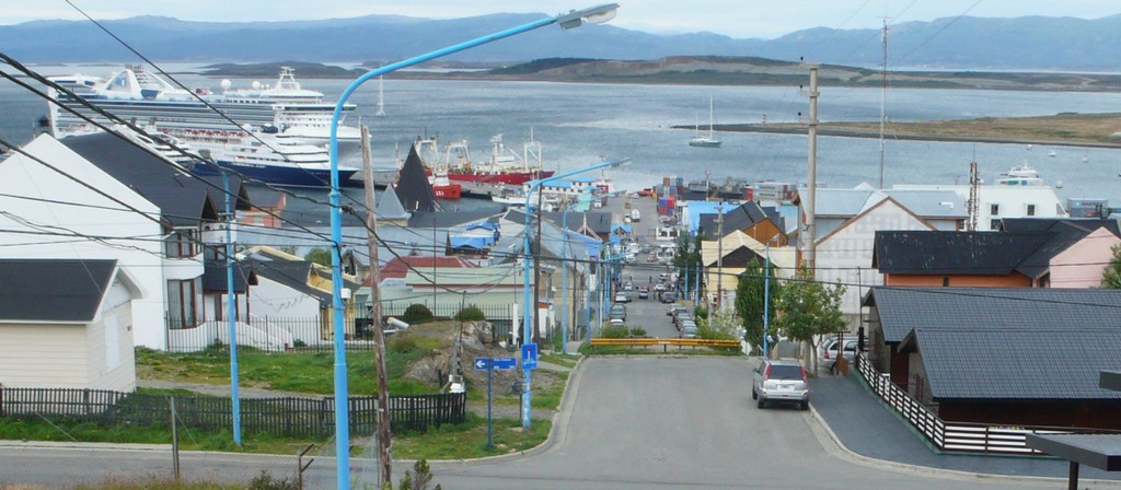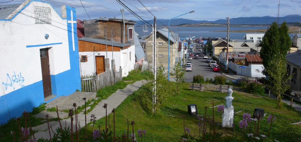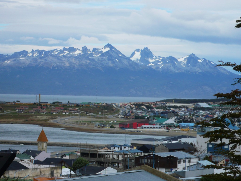 En arrivant à Ushuaïa, nous apercevons au loin les montagnes enneigées du Cerro Martial, les pieds dans le Canal Beagle. A l'entrée de la ville, un patchwork de maisons dépareillées, de toutes les couleurs et de toutes les formes, en bois et en tôle ondulée.