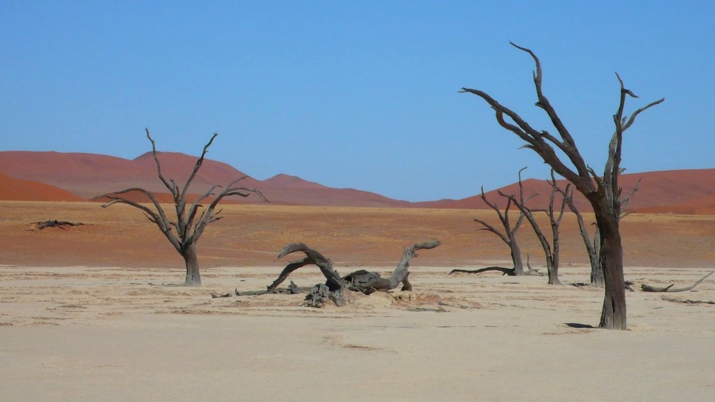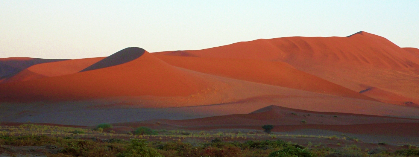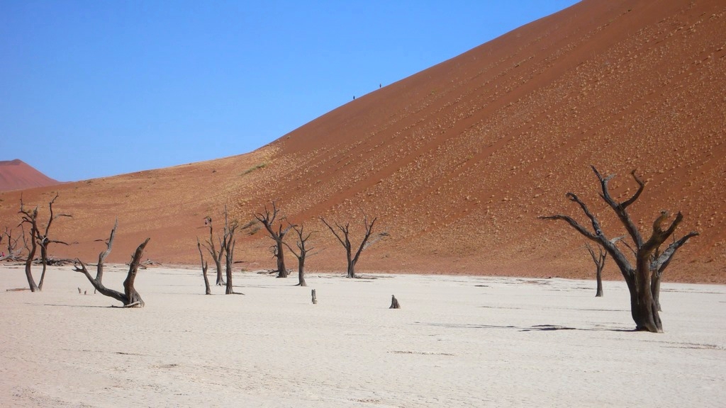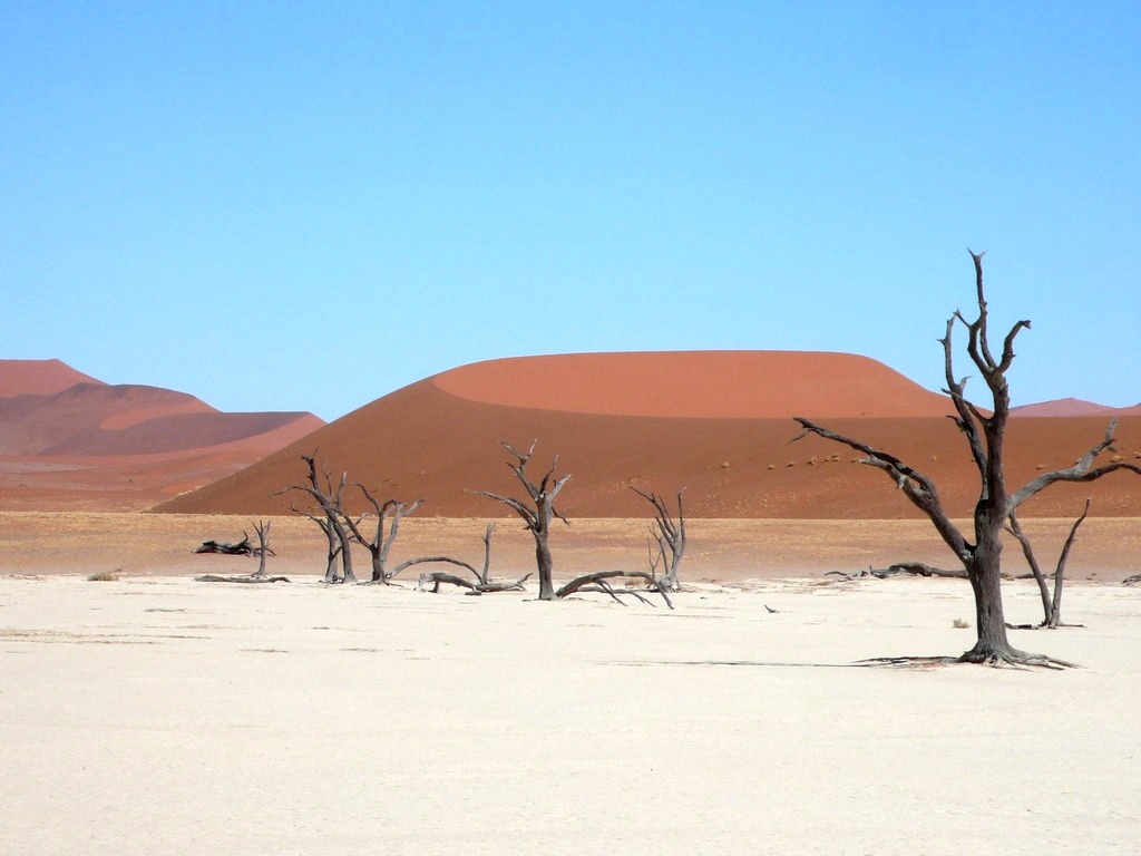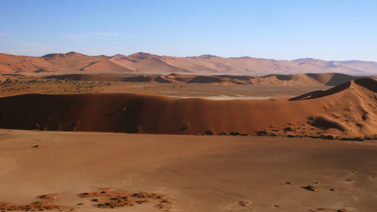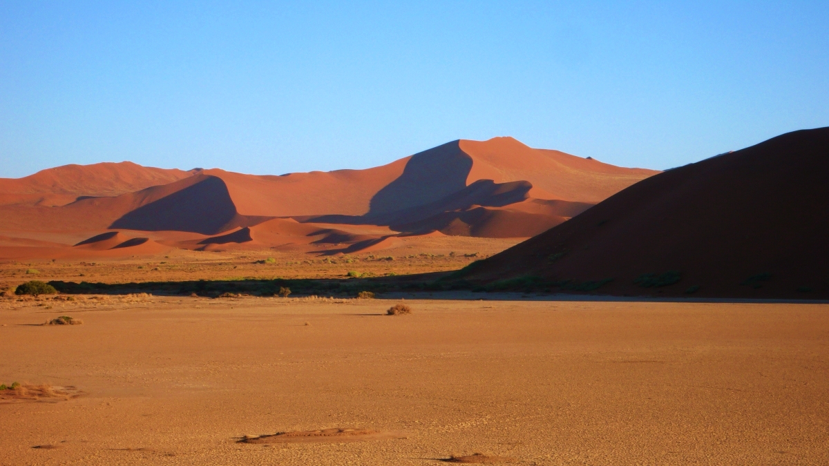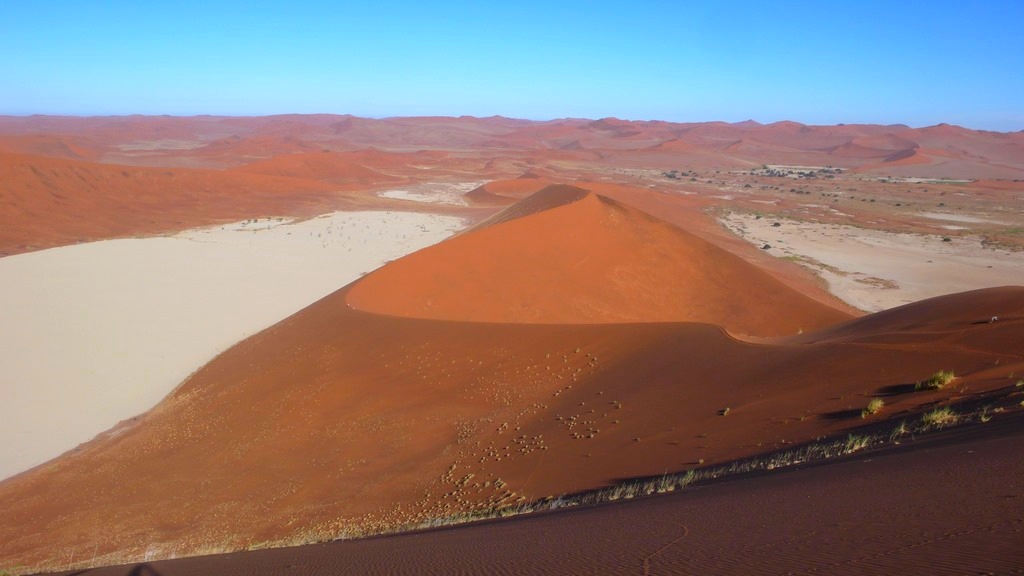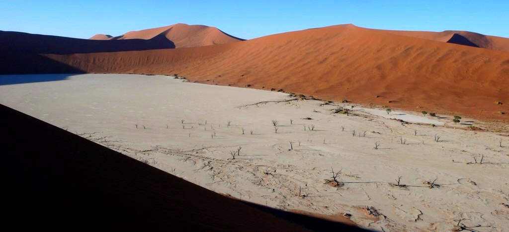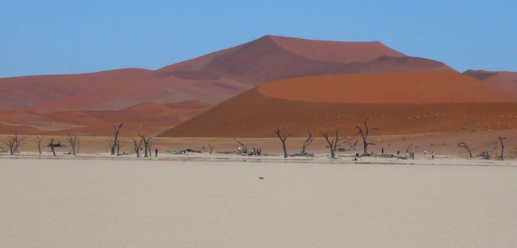 La végétation est faible et rarement arrosée par la rivière Tsauchab car l'eau s'enfuit rapidement dans l'argile asséché. Le Dead Vlei, au pied des dunes est un salar immaculé qui s'ajoute à la magie du paysage. Le rouge naturel de ces pyramides contraste avec le bleu du ciel, tout au long de l'année. Les dunes les plus hautes mesurent plus de 375 mètres, elles figurent parmi les plus élevées du monde.