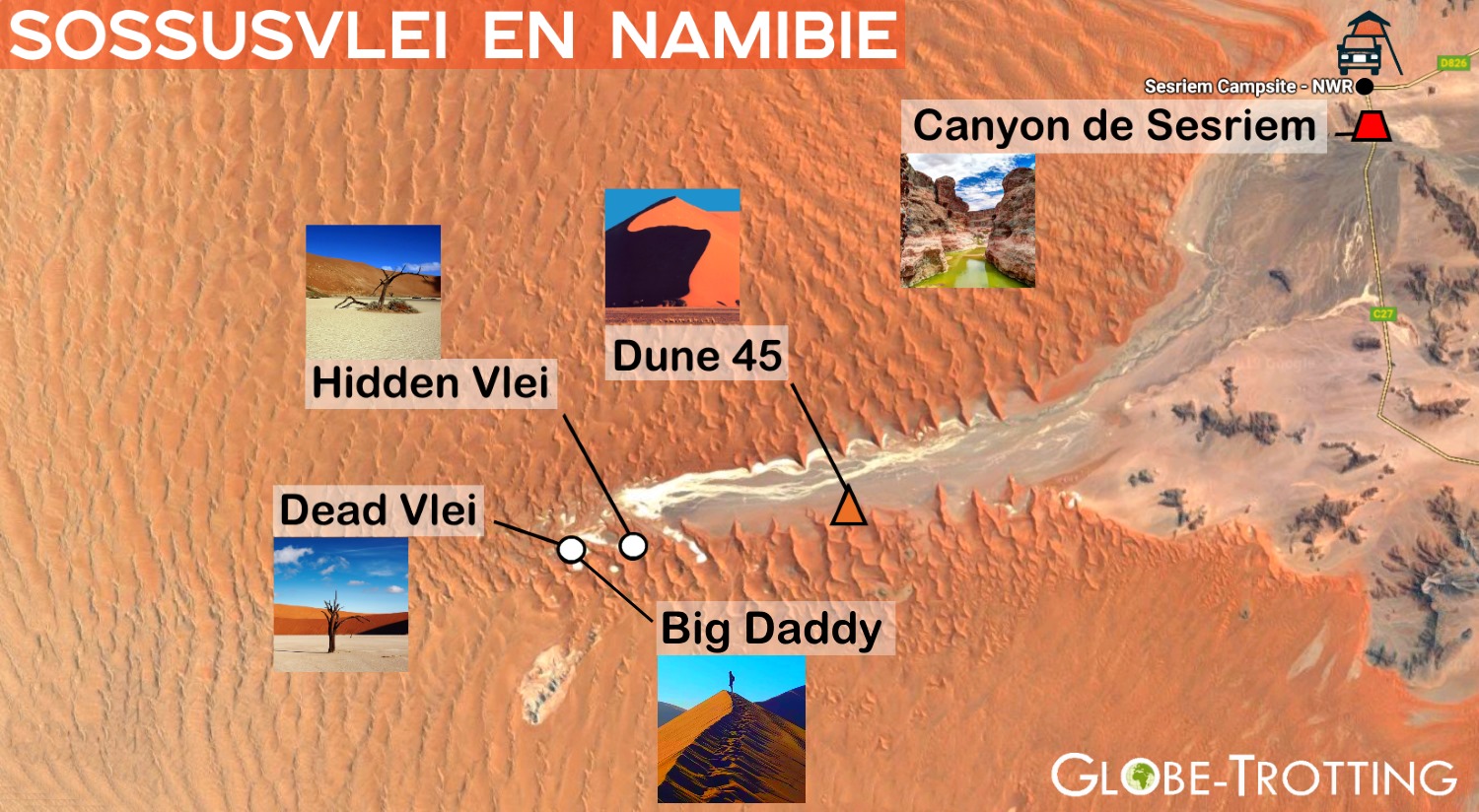 Pour partir à la découverte des Dunes de Sossusvlei, il faut rejoindre le parc national de Namib Naukluft qui se trouve en partie dans le désert du Namib et dans les monts Naukluft. L'entrée dans ce parc se fait à Sesriem, où se trouve un camp nommé NWR Campsite qui permet de passer la nuit dans l'enceinte de la réserve et ainsi partir à la découverte des lieux avant le lever du soleil.