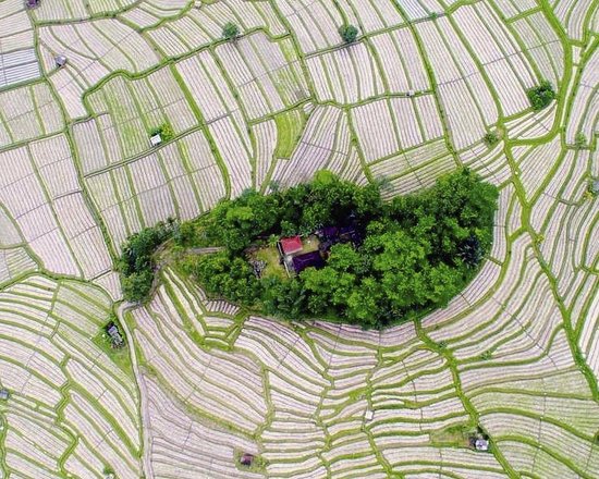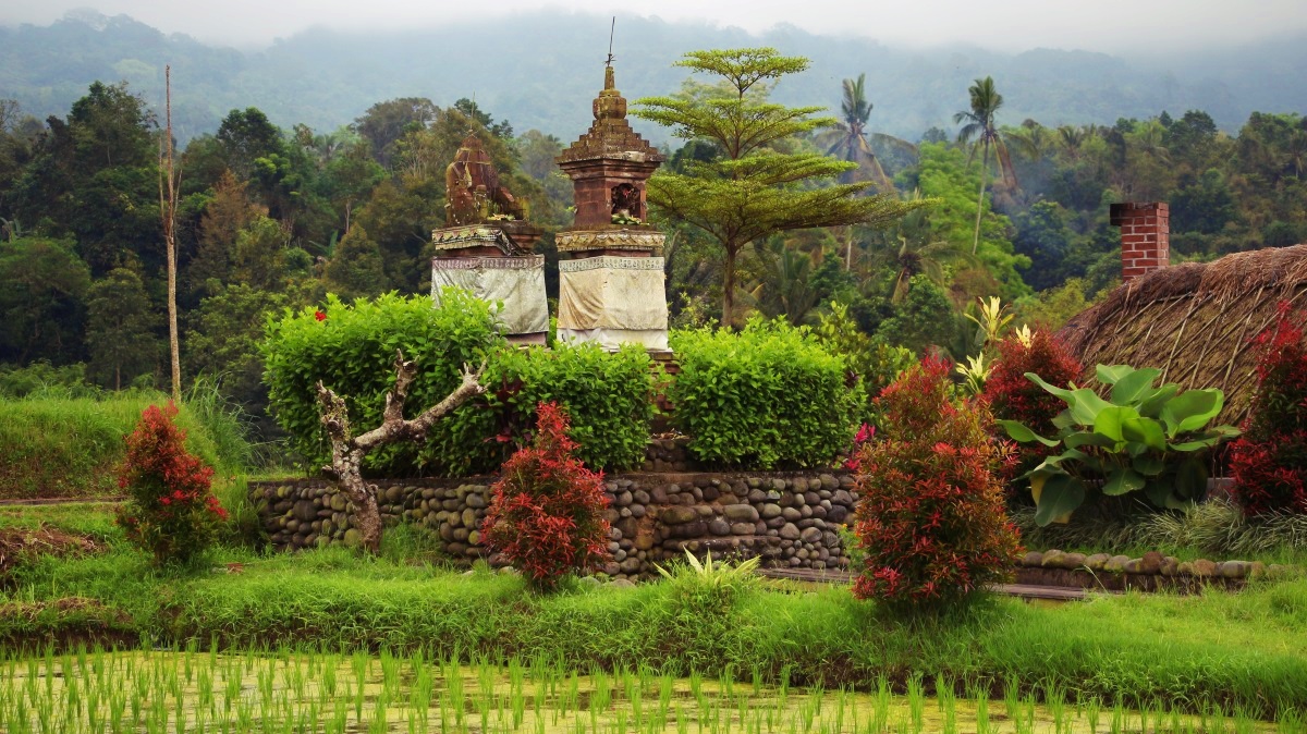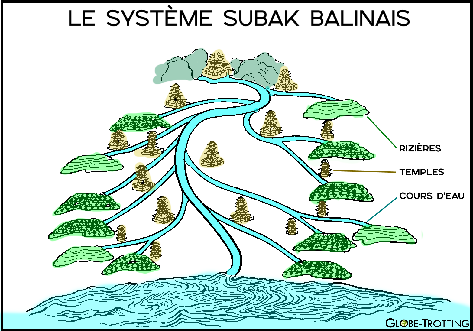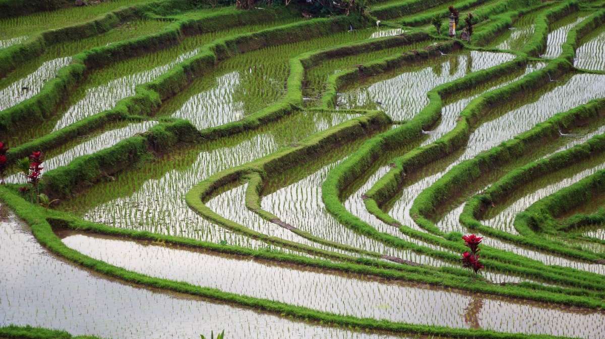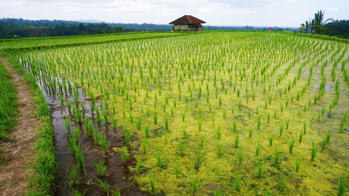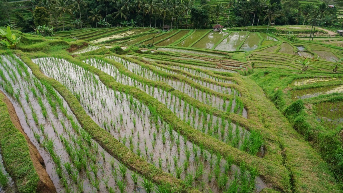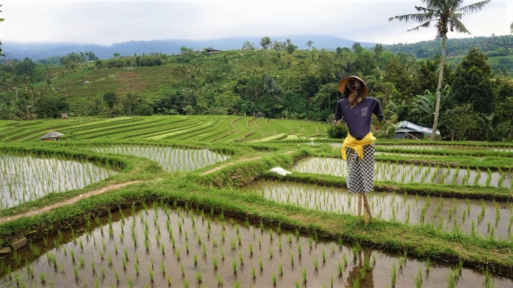 Dans ces rizières, on se promène au hasard sous le soleil de Bali, profitant de panoramas majestueux, apercevant ici et là des paysans courbés, des épouvantails dressés et des cerfs volants qui dansent dans le ciel pour effrayer les oiseaux indésirables.