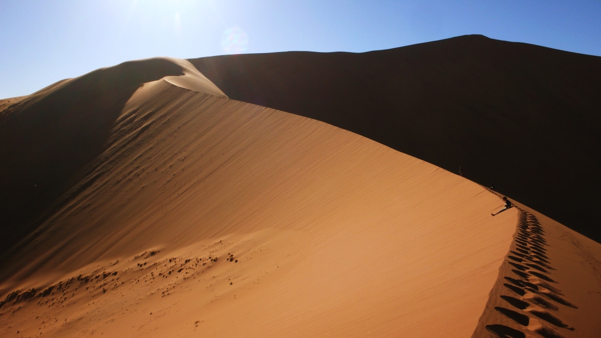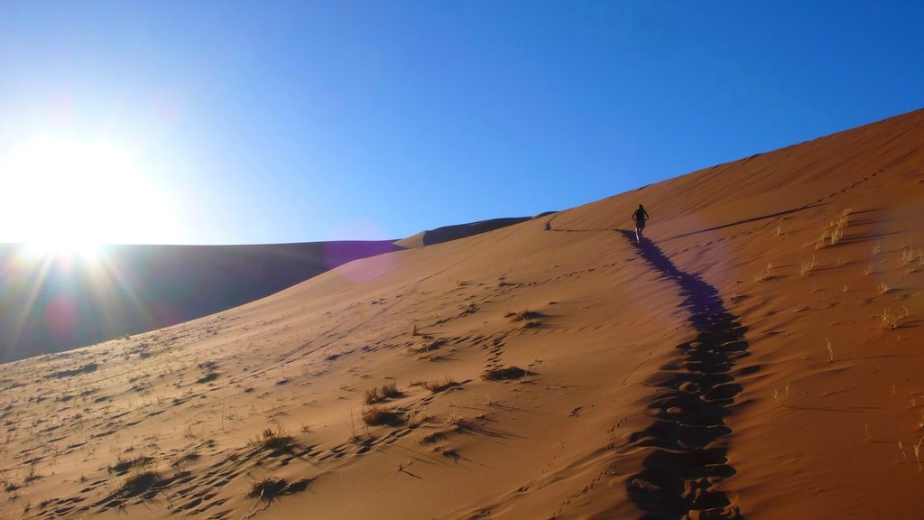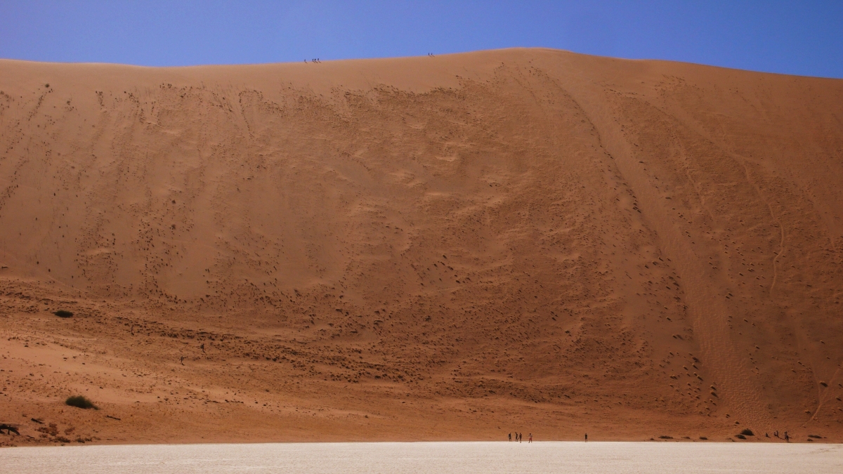 Nous avons d'abord commencé par l'ascension de la Dune 45. La Dune 45 culmine à plus de 170 mètres de hauteur, et son nom vient de la distance en kilomètres la séparant du Canyon de Sesriem. Il faut une bonne heure pour arriver au sommet.