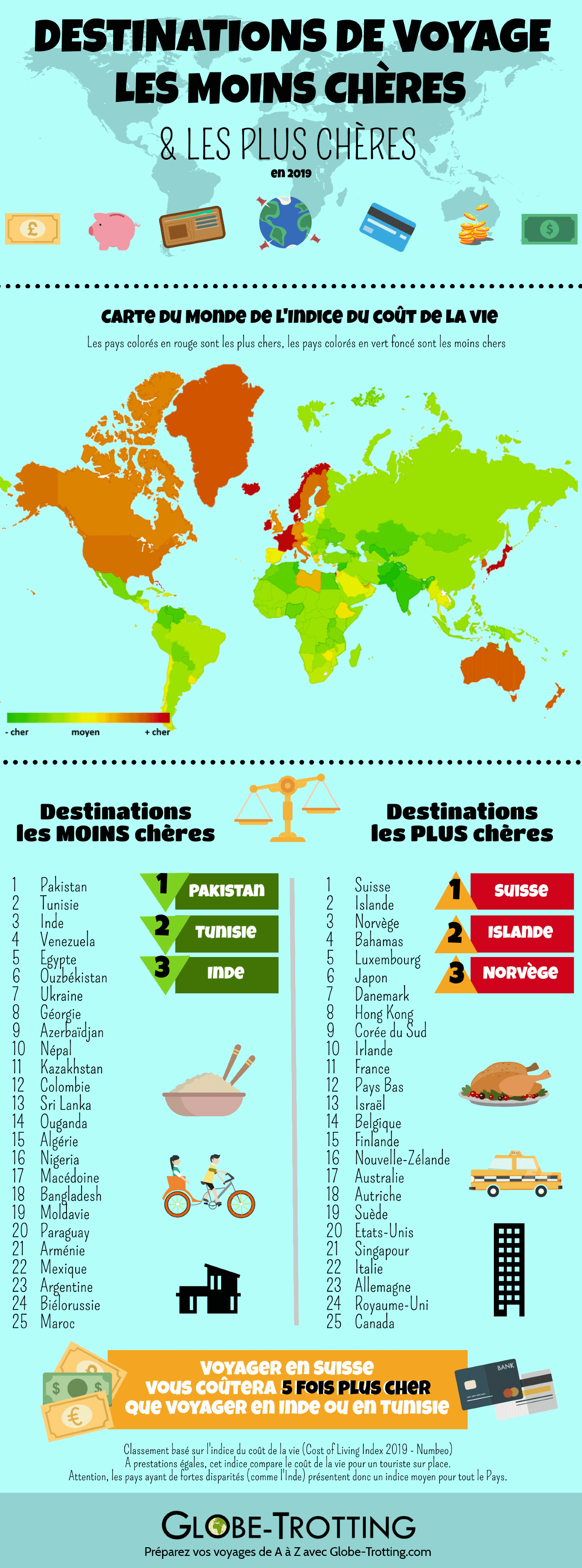 Quelles sont les destinations de voyages les moins chers du monde ? Et à contrario, quelles sont les plus chères ? Où faut-il partir pour voyager de façon économique et quels Pays fuir absolument si on a des moyens limités ? Voici un aperçu des destinations où le coût de la vie est le plus bas ou le plus élevé au Monde, afin de vous aider à savoir si votre envie de voyage est en accord avec votre porte monnaie.