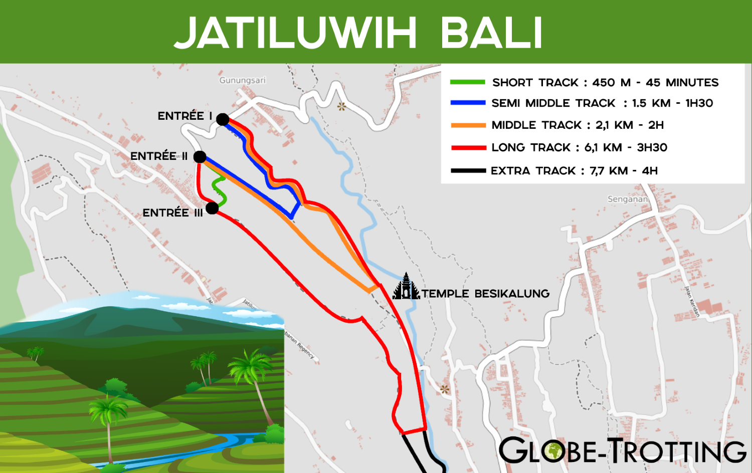 Les temps indiqués ne correspondent pas au temps nécessaire pour les parcourir sans s'arrêter mais au temps recommandé pour une visite agréable, complète, avec des arrêts photos et tout ce qu'il fat pour profiter de votre marche. En effectuant les marches oranges, rouges et noires, vous passerez par le superbe et paisible temple Besikalung.