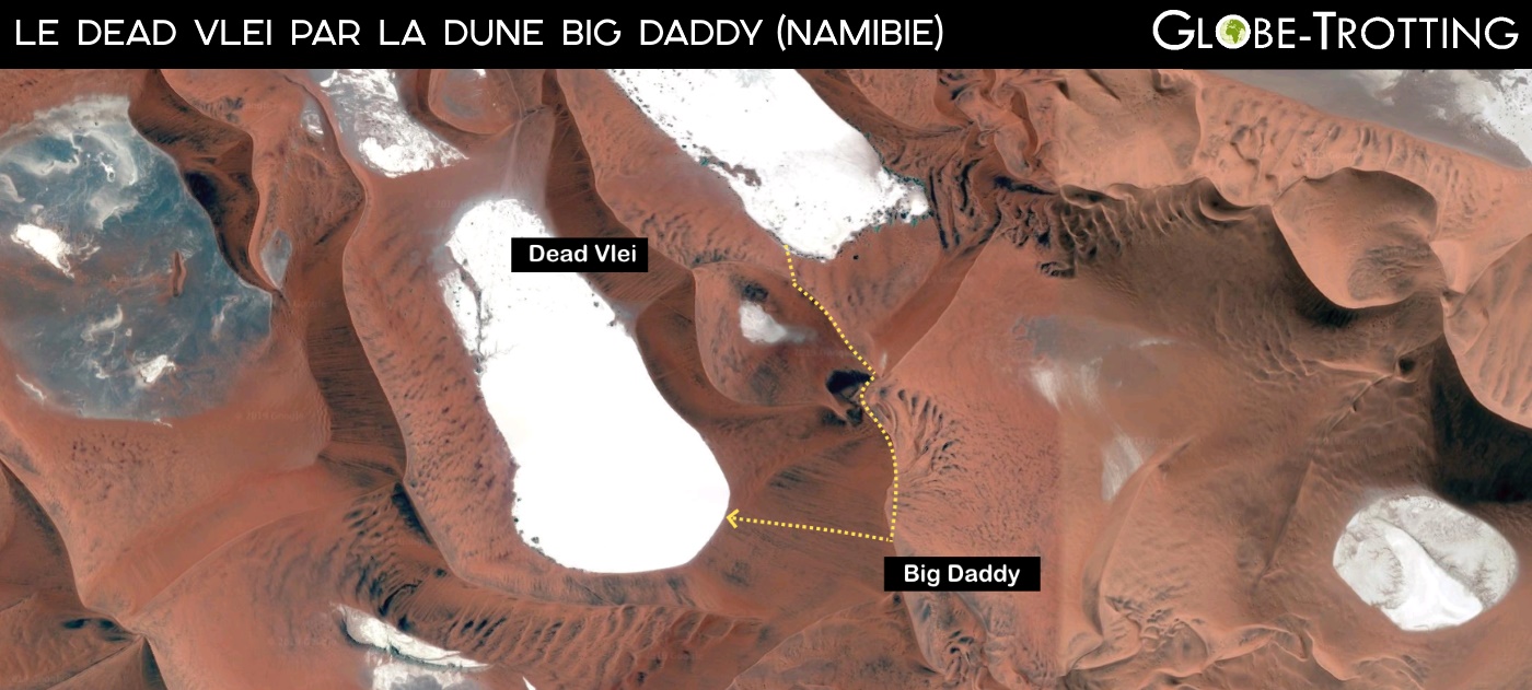 La meilleure option consiste à grimper en haut de la dune nommée "Big Daddy" ou "Crazy Dune" à 325 mètres d'altitude. Cela vous demandera d'abord de marcher 5 kilomètres depuis votre lieu de stationnement (ou de prendre un navette du parc, la seule autorisée à rouler ici). Ensuite, la montée de la dune vous demandera une demi heure environ, sans trop d'efforts à part la résistance aux températures. Une fois là haut, non seulement vous aurez une vue comme vous ne pouvez pas l'imaginer mais en plus vous pourrez dévaler la pente ou glisser sur ce toboggan naturel pour atterrir... sur le Dead Vlei !Si vous n'avez pas la capacité ni l'envie de marcher et de monter en haut de Big Daddy, vous pourrez tout simplement vous rendre au Dead Vlei en navette directement !