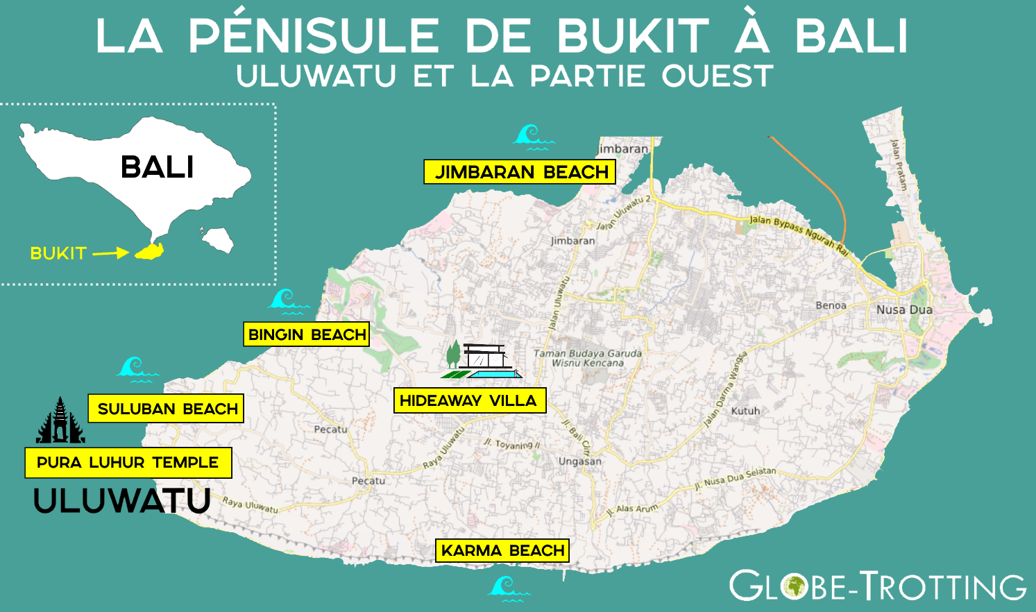 Sur la carte ci-dessous je vous indique les principaux points d'intérêt d'Uluwatu et ses alentours :