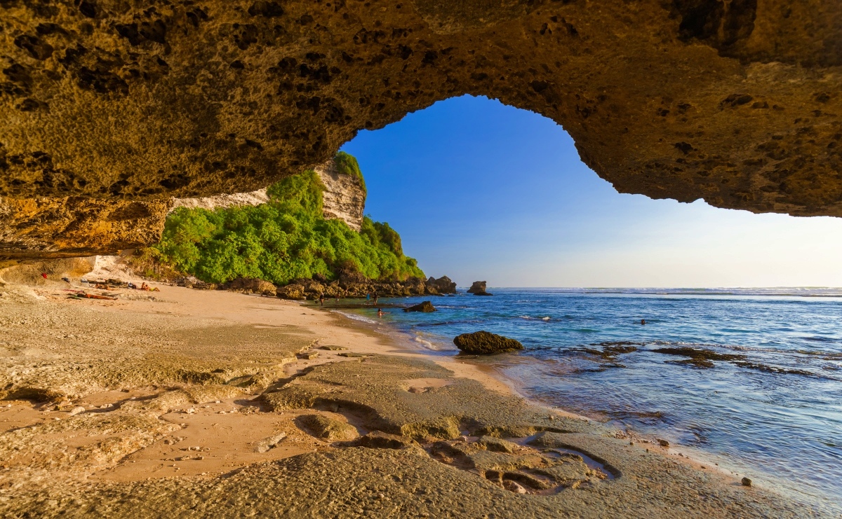 Suluban Beach est nommée "Blue Point Beach" , elle est entourée d'immenses falaises calcaires, elle s'étend jusqu'à Uluwatu Beach et on y accède par des escaliers fixés sur la roche. On y accède uniquement par marée basse car il faut passer par une grotte très étroite, certains la nomment donc la plage cachée pour cette raison. C'est une plage incontournable de la péninsule de Bukit !