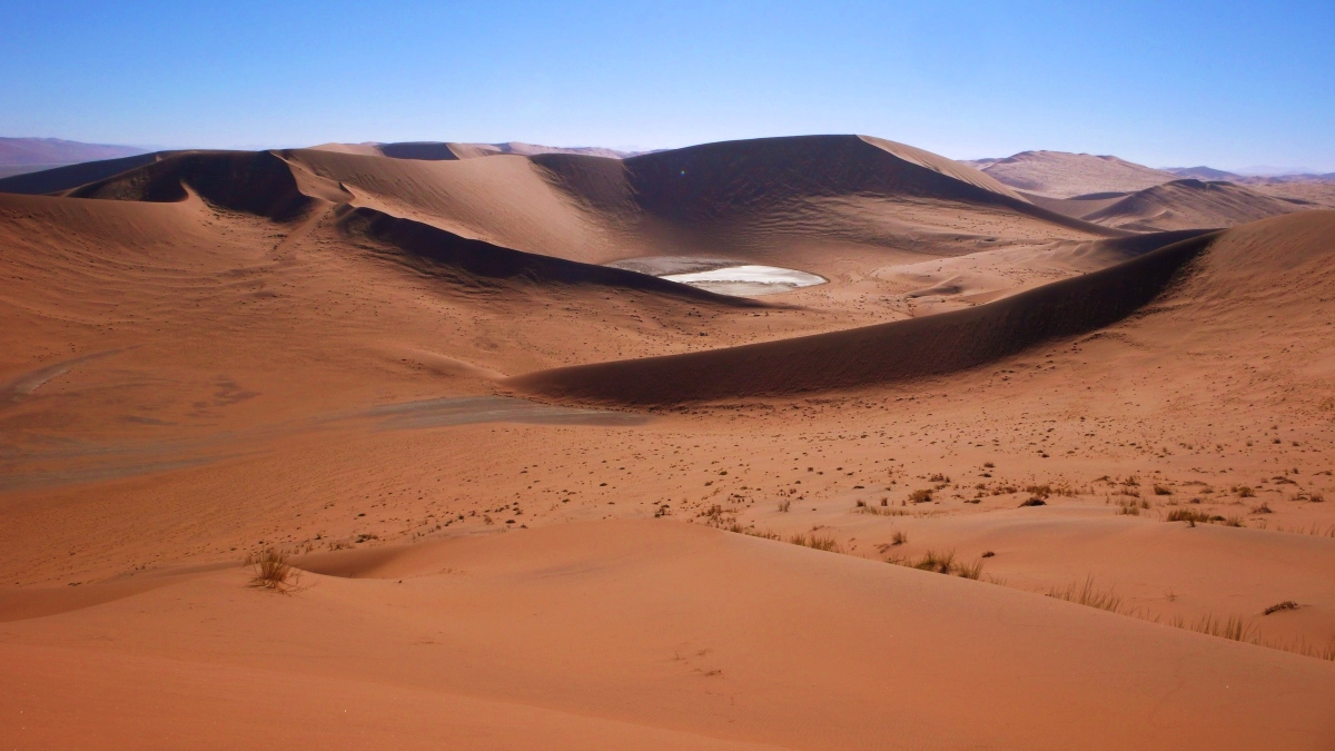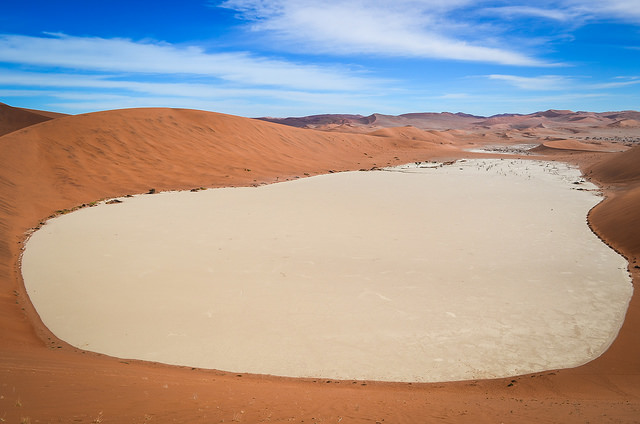 Ce désert de sel et d'argile offre des couleurs vive aux dunes qui font jusqu'à de 50 km de large. La formation des dunes de Sossusvlei remonterait à plus de cinq millions d'années. Le courant de Benguela aurait conduit le sable ici puis les vents soufflant à l'intérieur des terres au nord-ouest auraient provoqué la formation des dunes. Les dunes du Namib sont constituées de sable de quartz coloré et d’oxyde de fer en provenance du Kalahari. On sait que plus la nuance de rouge est intense, plus la dune est âgée.