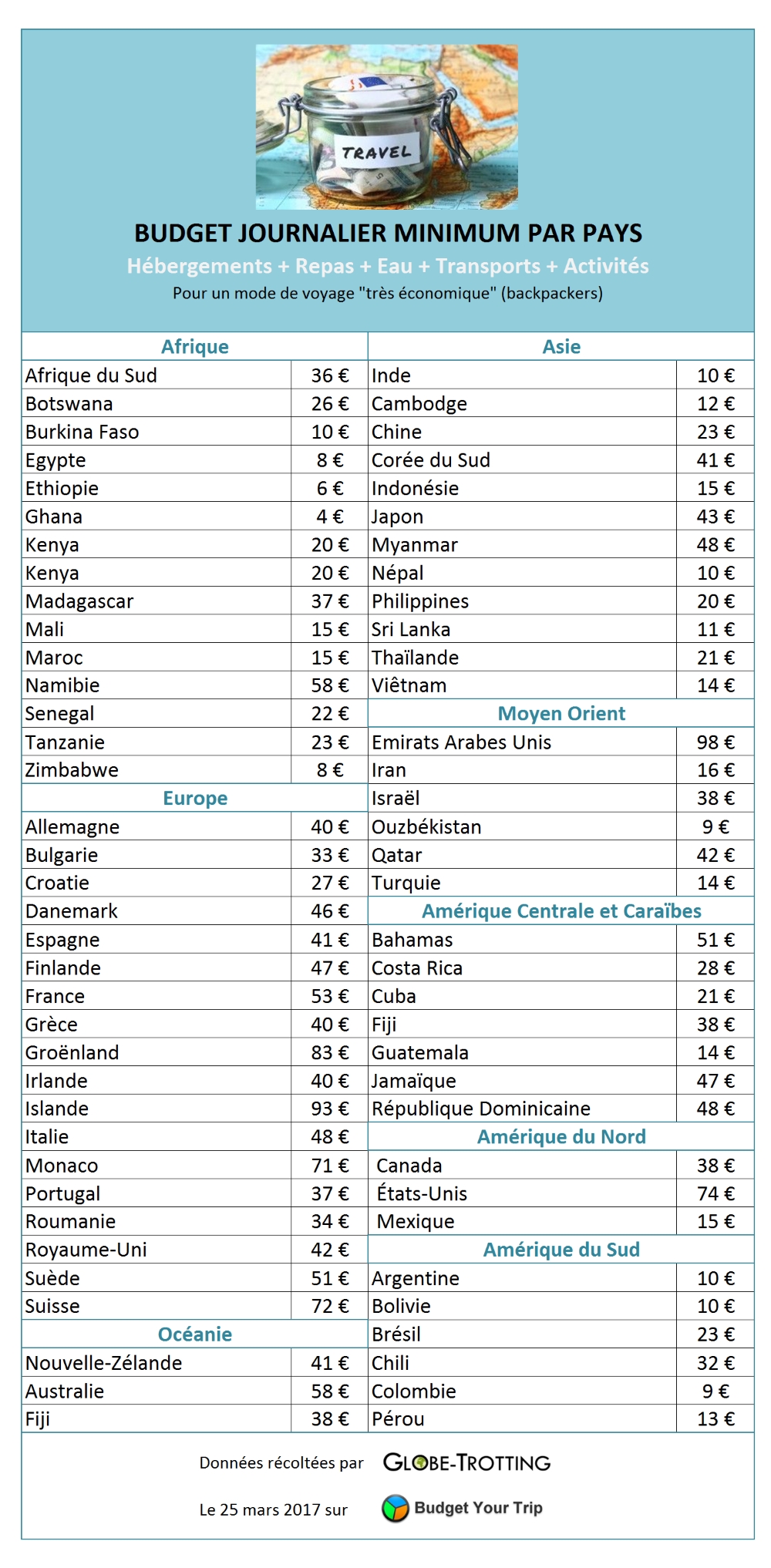 Il s'agit d'un budget minimum par personne pour un confort "moyen", type voyage d'un jeune couple sur la base de 3 repas "corrects" par jour et d'une chambre double par nuit dans un établissement de catégorie moyenne.