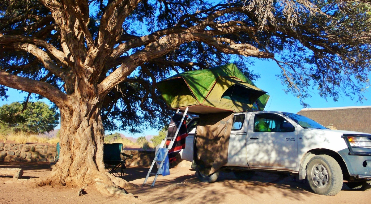 Nous avions garé notre 4X4 au camp de Sesriem, le plus proche pour découvrir les dunes au petit matin. Le campement de Sesriem est parfait pour camper sur le toit de notre 4X4.